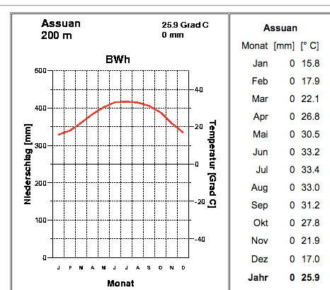 De gemiddelde temperatuur is 25,9 graden Celcius en er valt 0 mm neerslag dus de Assuan is alleen maar woestijn dat is warm. Egypte is 1.010.000 km² dat is best groot dat is ongeveer 25 keer Nederland. De hoofdstad is Cairo in Egypte wonen ongeveer 90miljoen mensen. En 0,6 % bestaat uit water